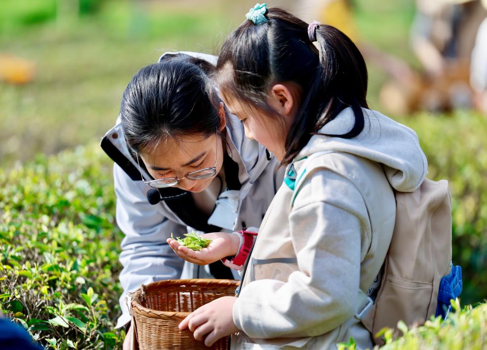 4月1日,来自合肥市的学生在黄山市徽州区谢裕大茶博园体验采茶。新华社发(施亚磊 摄)