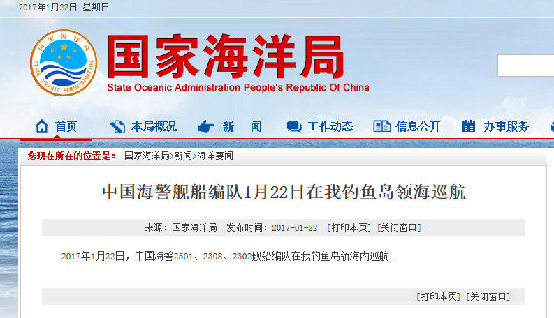 新華網(wǎng)北京1月22日電 據(jù)國家海洋局網(wǎng)站報道,2017年1月22日,中國海警2501、2308、2302艦船編隊在我釣魚島領(lǐng)海內(nèi)巡航。