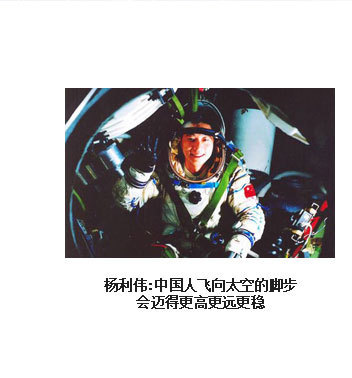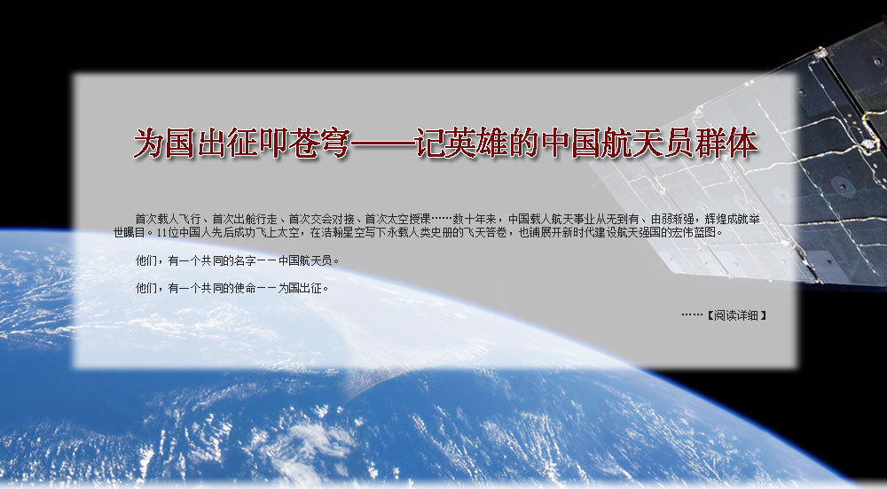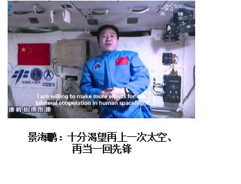 ??? 為了人類的和平與進(jìn)步,中國人來到了太空。2003年10月15日,我搭乘神舟五號飛船,在太空飛行14圈,歷時21小時23分,完成了中國首次載人航天飛行。雖然是獨(dú)自在太空飛行,但一想到億萬祖國人民翹首以待,我覺得不是一個人在飛。于是我拿起太空筆,在工作日志的背面寫上了這樣一句話:“為了人類的和平與進(jìn)步,中國人來到了太空”,并在艙內(nèi)鏡頭前向祖國人民、世界人民展示?!盀榱巳祟惖暮推脚c進(jìn)步”,是中國發(fā)展載人航天事業(yè)的初衷,“中國人來到了太空”既描述了一個歷史時刻,也表達(dá)了我為祖國航天事業(yè)感到無比自豪的心情。?