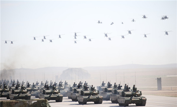 ????2017年7月30日,慶祝中國人民解放軍建軍90周年閱兵在位于內(nèi)蒙古的朱日和訓練基地舉行。這是坦克方隊和空中突擊梯隊。新華社記者 姚大偉 攝