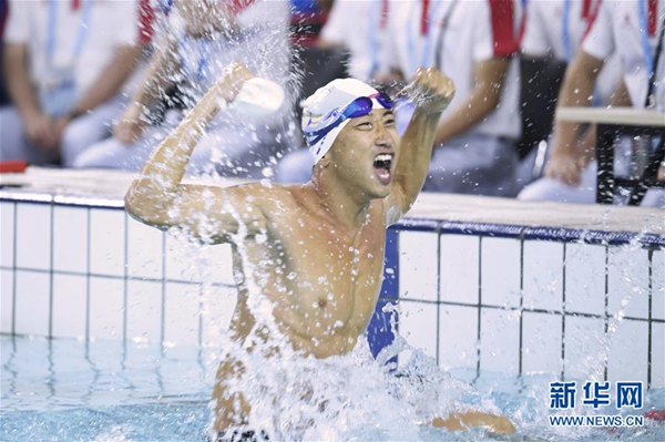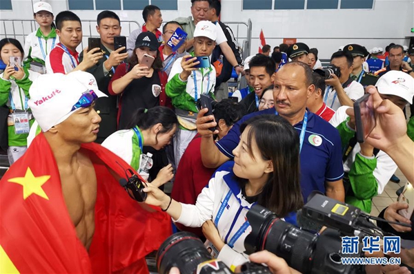 走出泳池,張政成了場(chǎng)上的“明星”,和幾個(gè)隊(duì)友擁抱擊掌后,便立刻被眾人圍在中間?,F(xiàn)場(chǎng)觀眾和其他運(yùn)動(dòng)員紛紛向他表示祝賀,人群中不時(shí)有人歡呼著“世界紀(jì)錄!世界紀(jì)錄!”。隨后,激動(dòng)的張政披著國(guó)旗,在泳池邊跟家人、朋友合影,定格了這難忘的一刻。