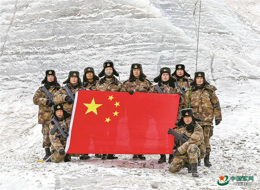 到達目的地后,官兵展開國旗向祖國和人民送上祝福。