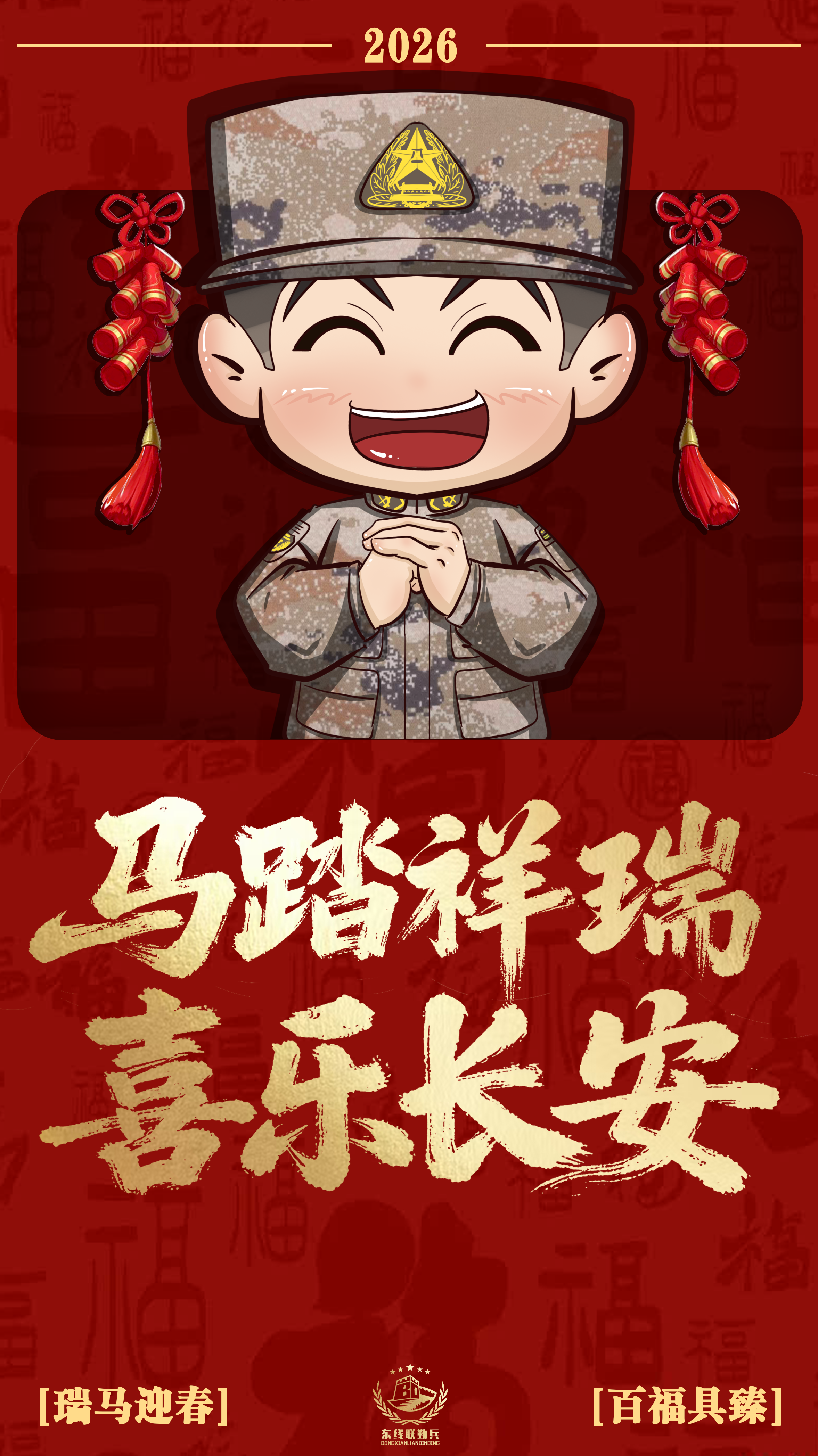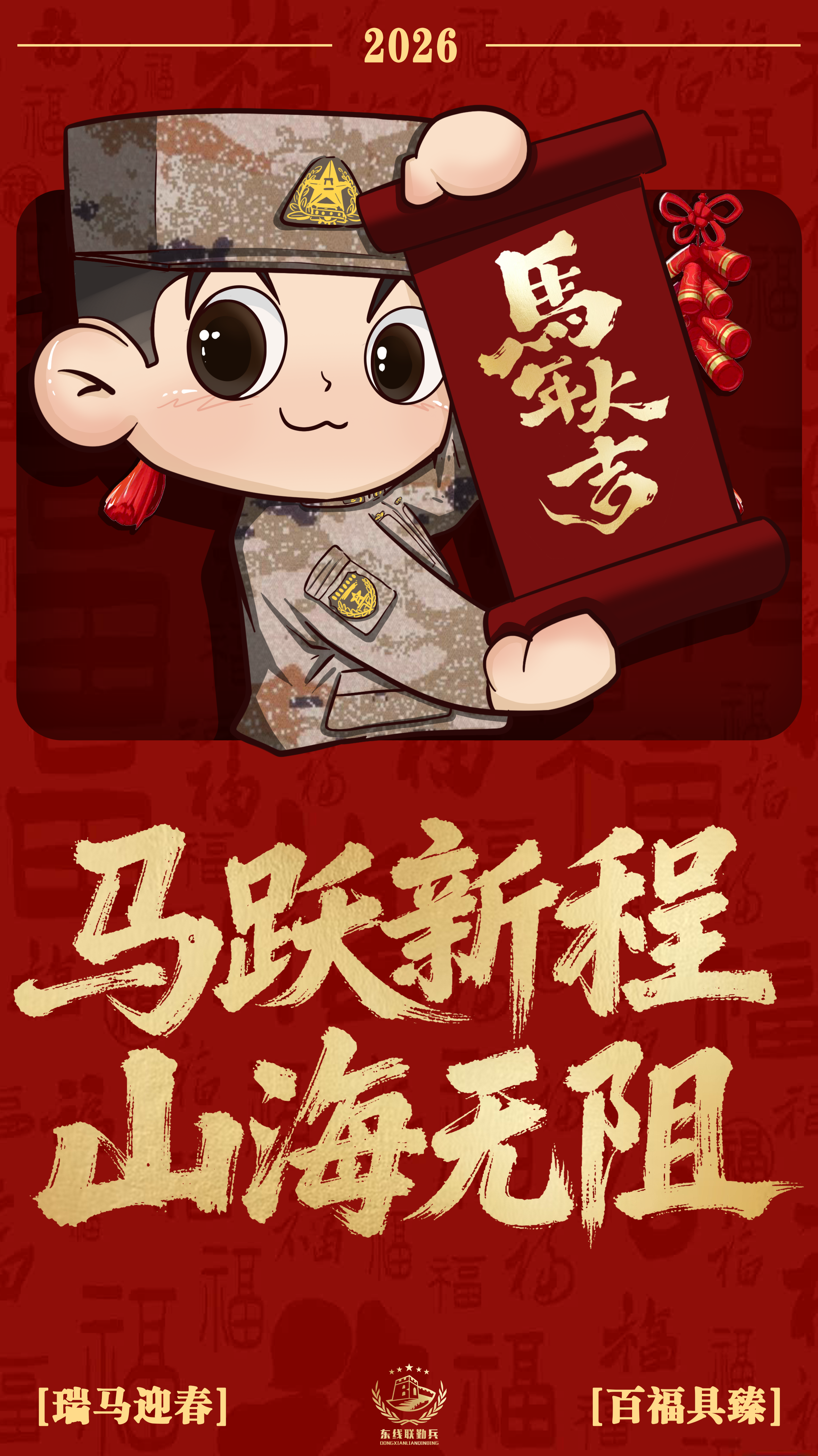 2026瑞马迎春,戎装焕彩贺新春!看兵哥哥卡通形象燃动年味,放鞭炮、舞醒狮,展军旅豪情。“马跃新程” 踏山海,“快马逐风” 启华章。东部战区联勤官兵携六重祝福,祝大家马年万事顺意、事业长虹,马行千里不负韶华,岁岁平安喜乐长安! (策划:赵若昕 董浩 形象设计:叶子民)