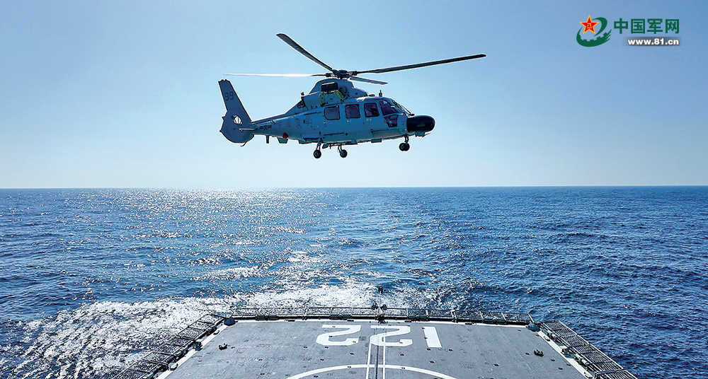 “前方海域发现多批可疑目标。”“直升机起降部署!”随着指令下达,唐山舰飞行甲板上,舰载直升机腾空而起,快速前出至“目标”海域上空,低空盘旋锁定“目标”,实时向编队回传信息。