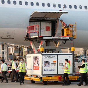 2月19日,在香港國際機(jī)場,工作人員將裝載疫苗的貨柜箱送往指定地點(diǎn)進(jìn)行儲存。新華社記者 李鋼 攝