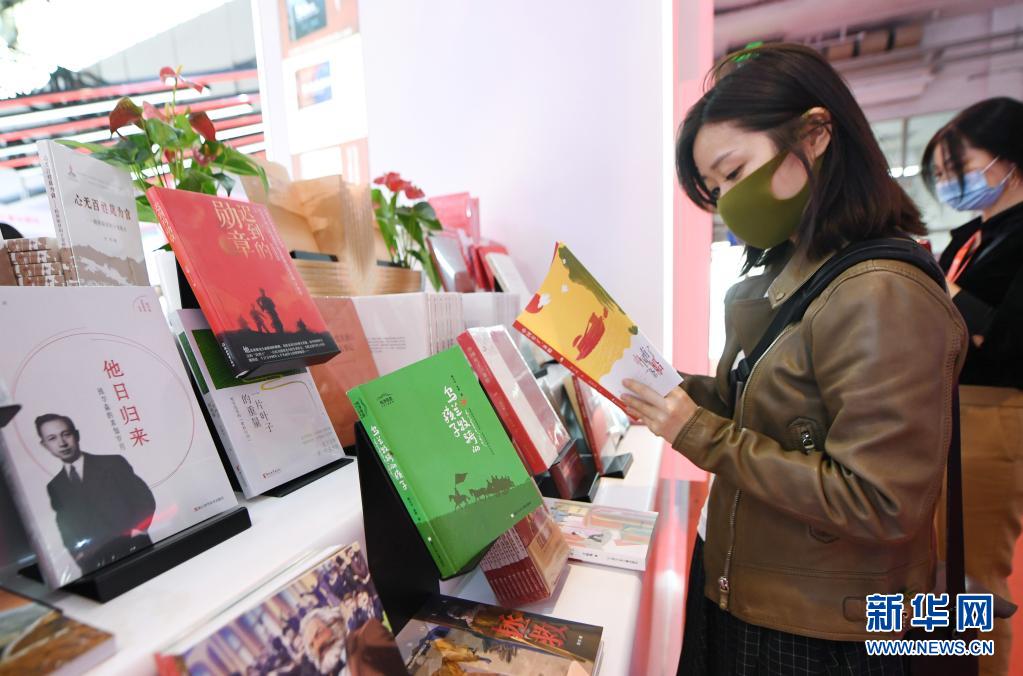 3月31日,參展人員在2021北京圖書訂貨會上閱覽書籍。