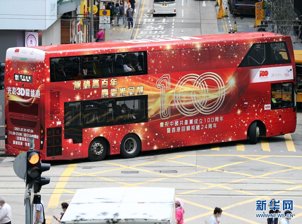 6月29日在香港街頭拍攝的公交巴士上的慶祝標語。