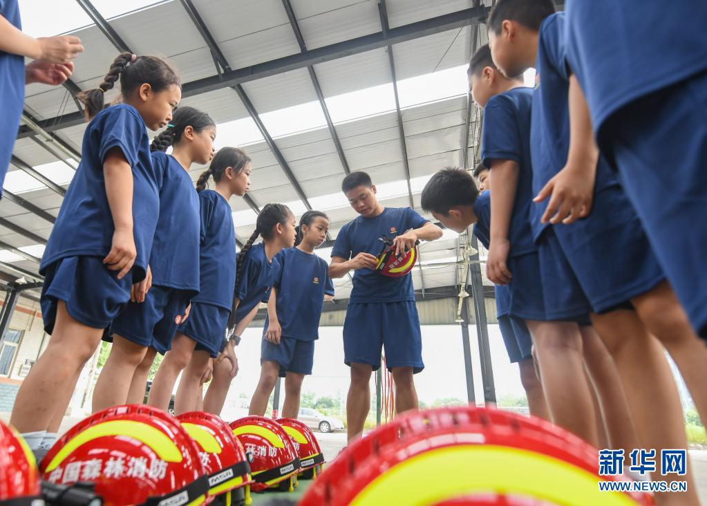 在四川省森林消防總隊(duì)特勤大隊(duì),消防員王波平(中)給孩子們講解穿戴消防頭盔的注意事項(xiàng)(7月27日攝)。