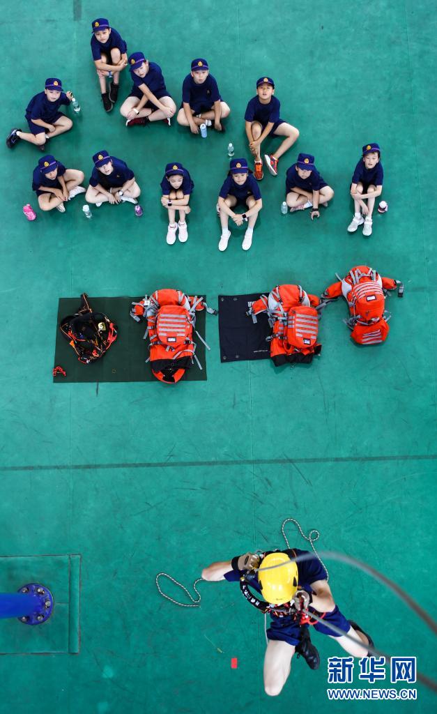 在四川省森林消防總隊(duì)特勤大隊(duì),孩子們在觀摩繩索高空救援(7月27日攝)。