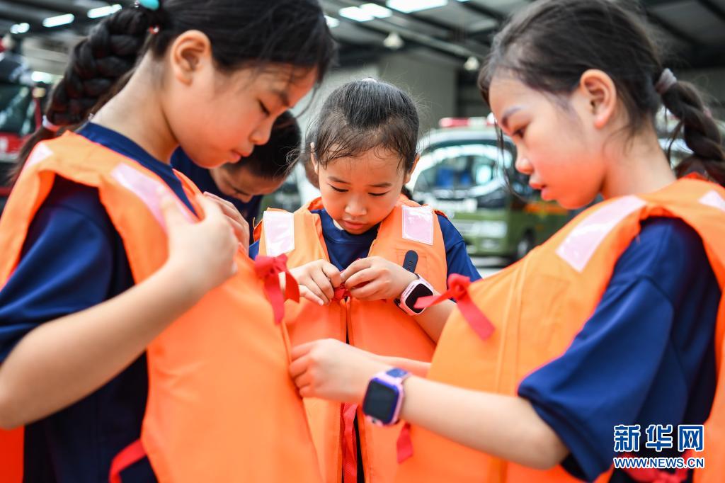 在四川省森林消防總隊特勤大隊,孩子們在練習(xí)穿救生衣(7月27日攝)。