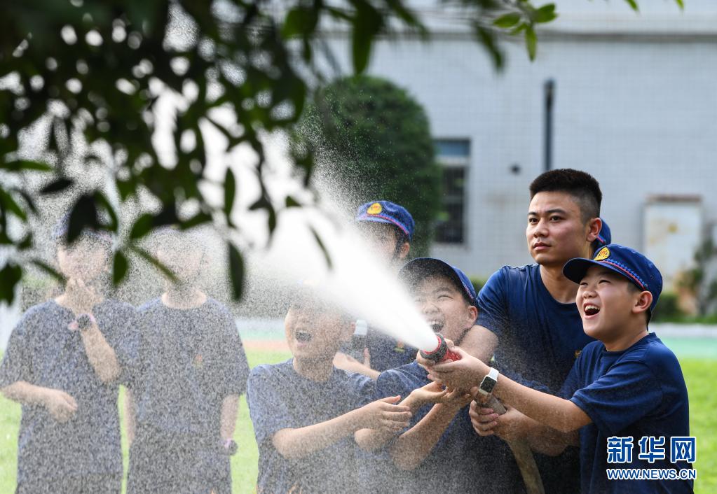 在四川省森林消防總隊(duì)特勤大隊(duì),消防員劉淘宇(右二)帶著孩子們體驗(yàn)水泵滅火操作(7月27日攝)。