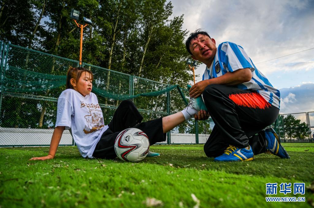 7月26日,在錫尼河西蘇木一處足球場,父親嘎拉巴特爾(右)給吉布斯樂瑪做腿部拉伸。