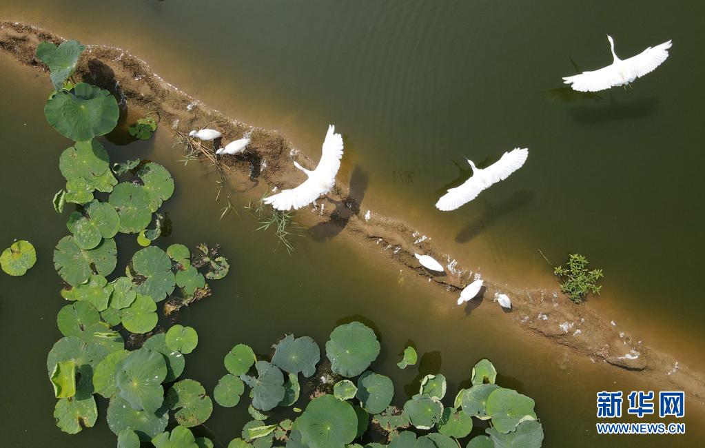 8月3日,白鷺在河北省新河縣白穴口村的藕田上空飛舞(無人機照片)。