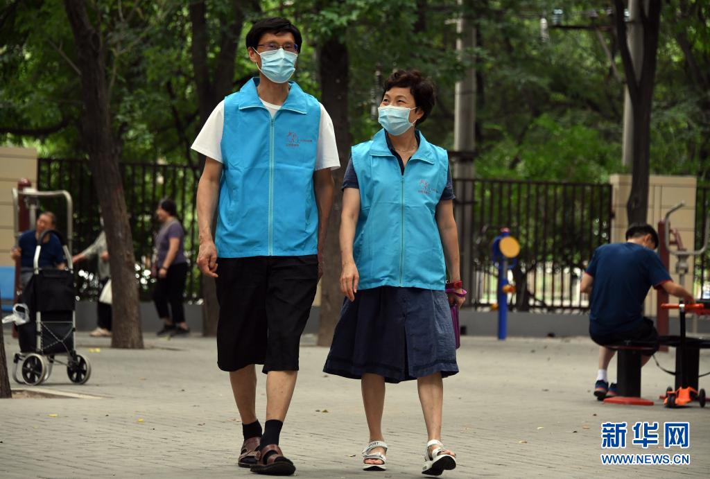 8月14日,在北京市海淀區(qū)薊門里社區(qū),馮向東與妻子董星梅準備去做志愿服務(wù)。