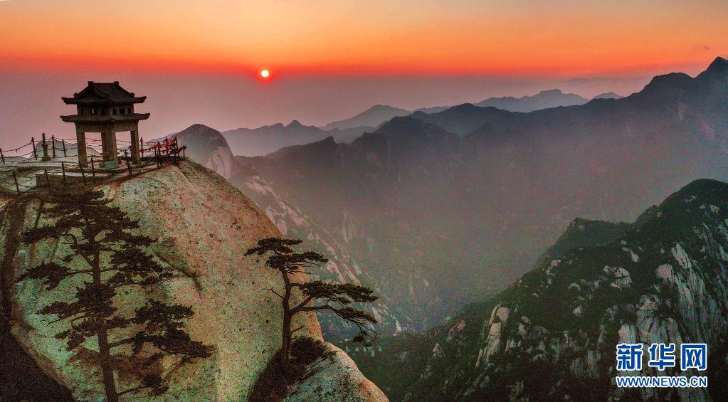 晨曦初露,位于陜西省渭南市的華山景區(qū)沐浴在霞光之中,景色壯美。