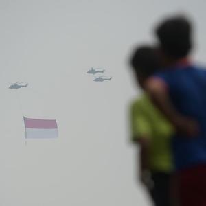 8月17日,人們注視著懸掛印度尼西亞國旗的直升機飛過雅加達上空。8月17日是印度尼西亞獨立日。新華社發(fā)(祖卡南攝)