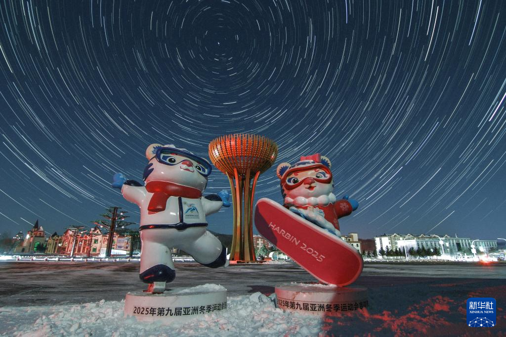 2月7日在亚布力滑雪旅游度假区拍摄的星空下的第九届亚冬会吉祥物(堆栈合成照片)。