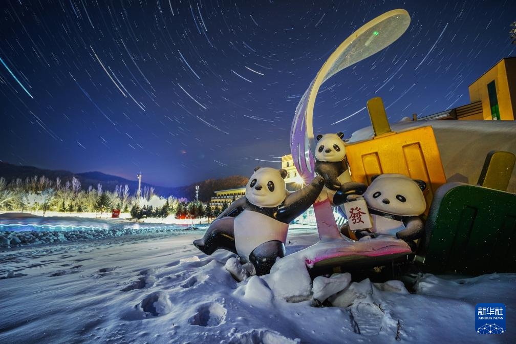 2025年11月28日在亚布力滑雪旅游度假区拍摄的星空下一处熊猫景观(堆栈合成照片)。