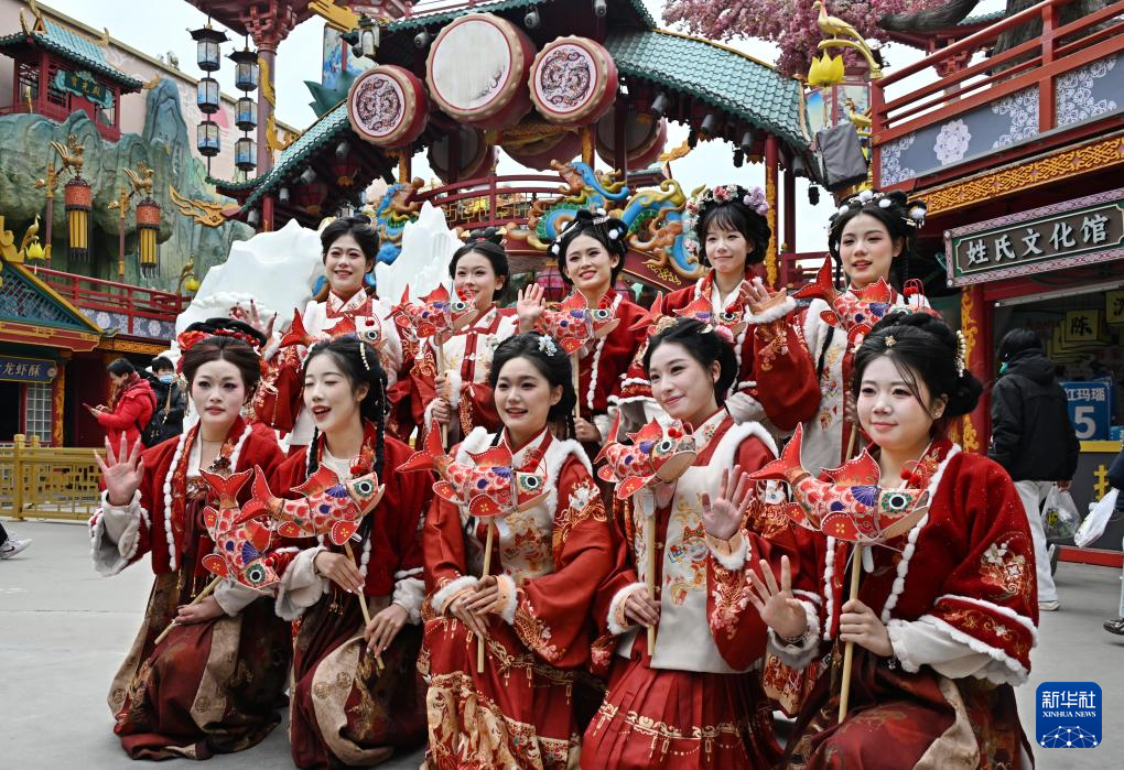 2月10日,演员在青岛市城阳区山海间不夜城主题街区合影。