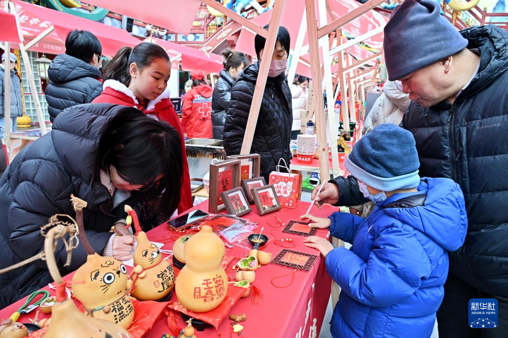 2月10日,在青岛市城阳区山海间不夜城主题街区,市民在非遗大集上参与互动体验。