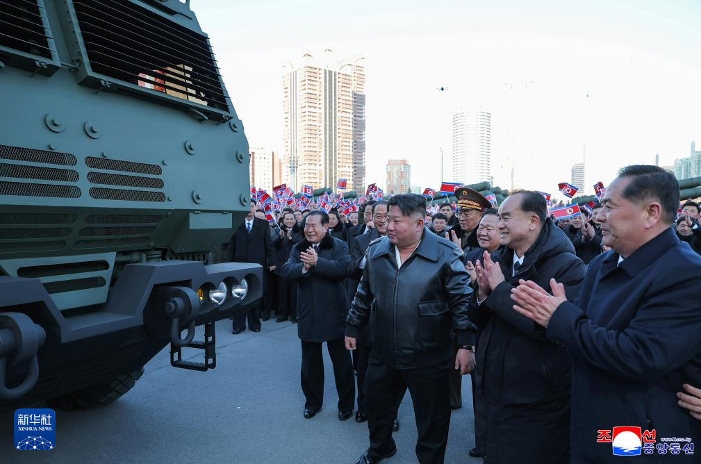 2月18日,金正恩在朝鲜平壤检阅火箭炮车。