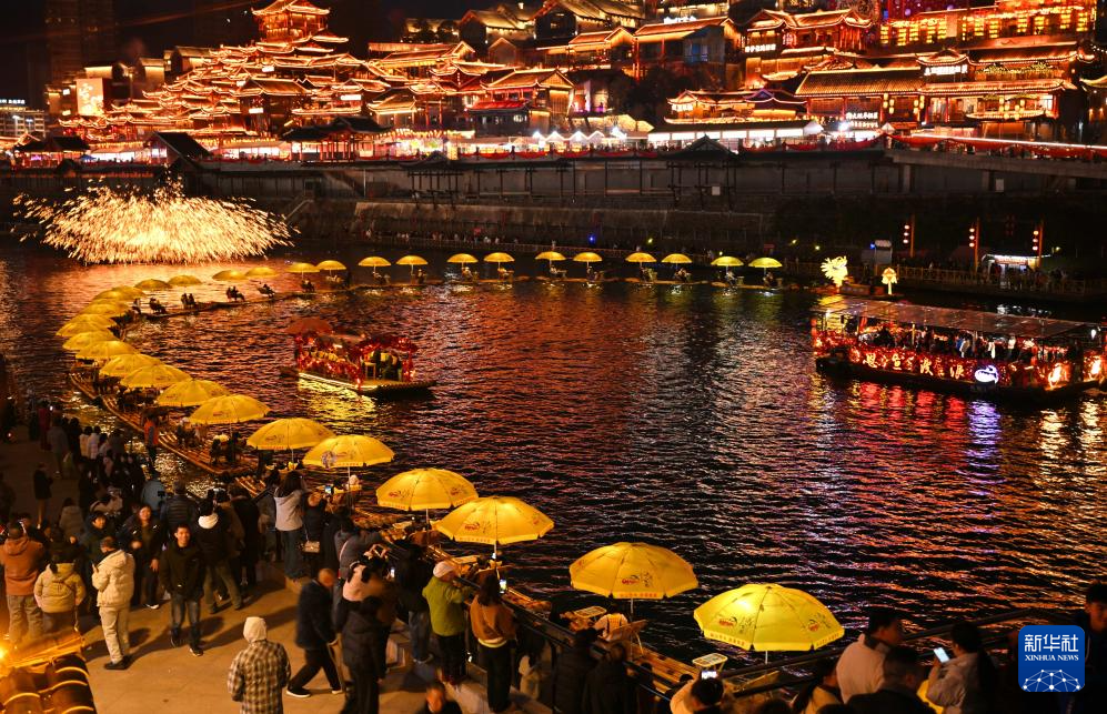 2月18日晚,游客在湖北省宣恩县城观赏彩灯“骏马”凌空飞腾。