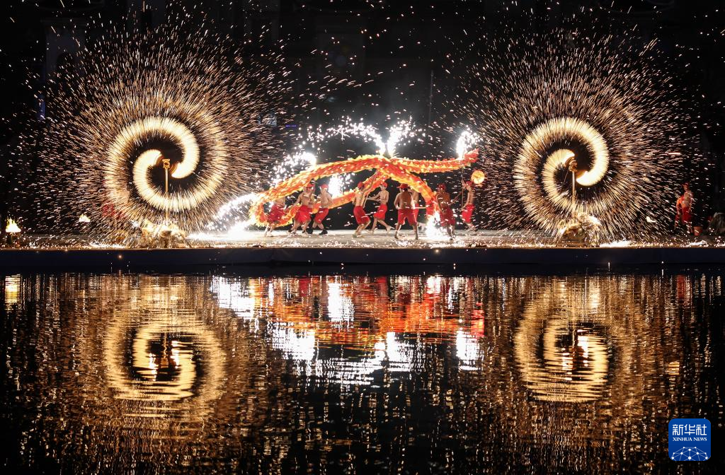 2月17日,民间艺人在湖北省襄阳市华侨城奇幻谷景区表演“火龙钢花”。