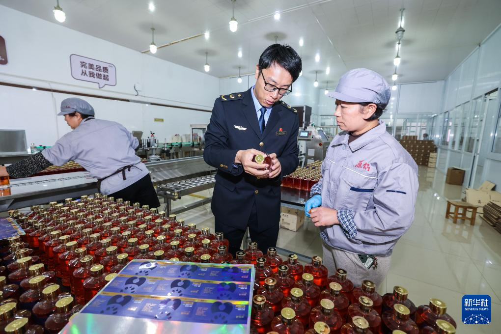 4月8日,诸暨市市场监督管理局同山所工作人员(中)在浙江原锅酒业有限公司包装车间对白酒商品标签进行现场检查、指导。