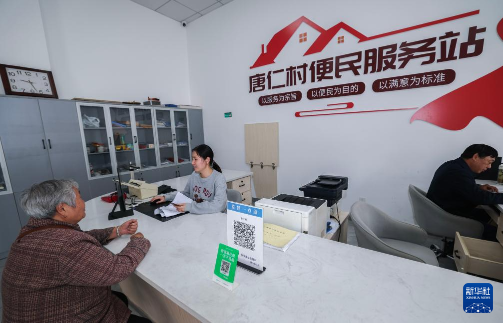 4月8日,诸暨市同山镇唐仁村村民(左一)在唐仁村便民服务站就近办理业务。