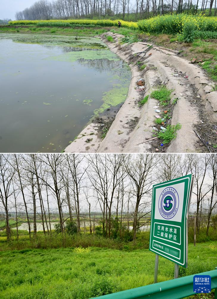 在华东某省,一处农田和水塘边有多个被丢弃的农药瓶和农药包装袋(上图),不远处竖有饮用水水源二级保护区的标牌(下图)(拼版照片,4月2日摄)。