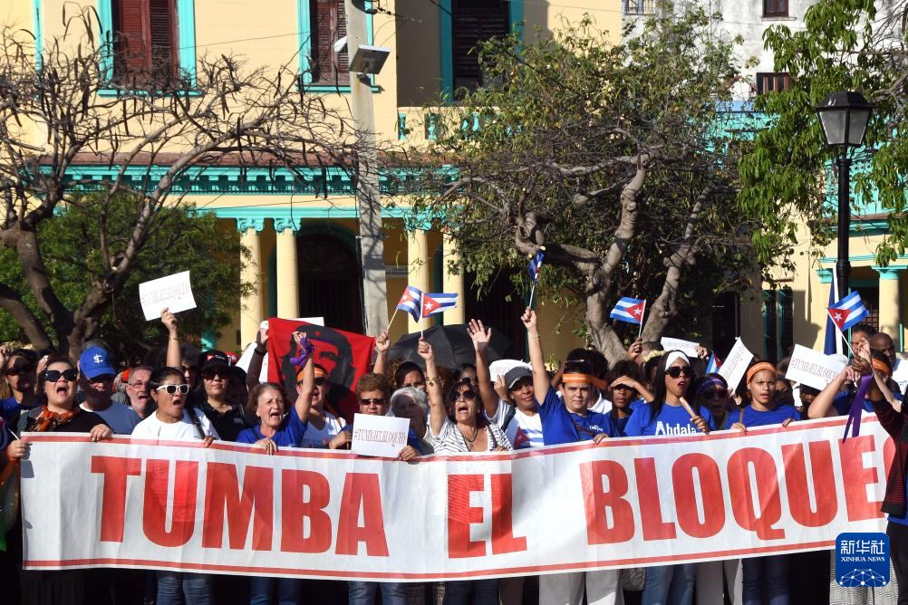 4月7日,在古巴首都哈瓦那,妇女们在集会现场手持“推翻封锁”的横幅和古巴国旗,谴责美国对古封锁。