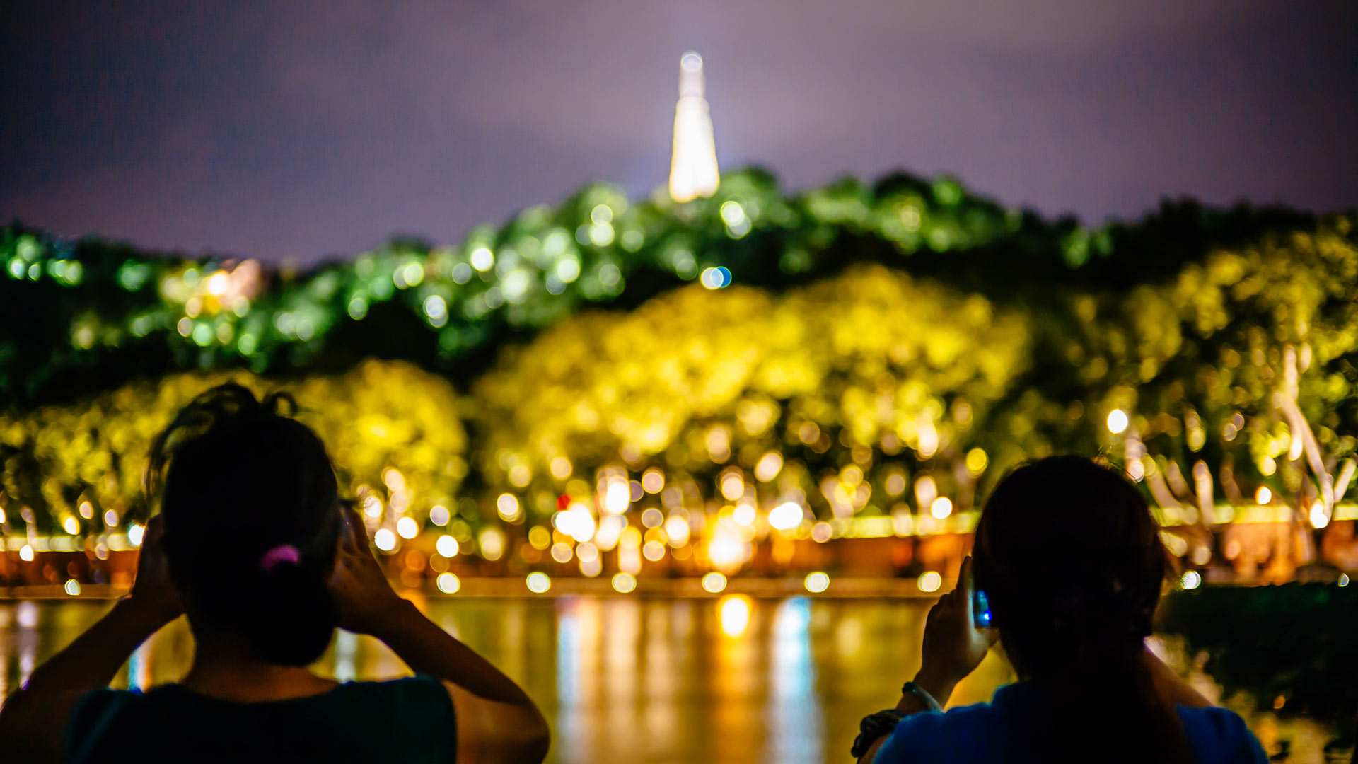 8月26日,行人在杭州西湖白堤上拍攝保俶塔夜景。新華社記者張鋮攝