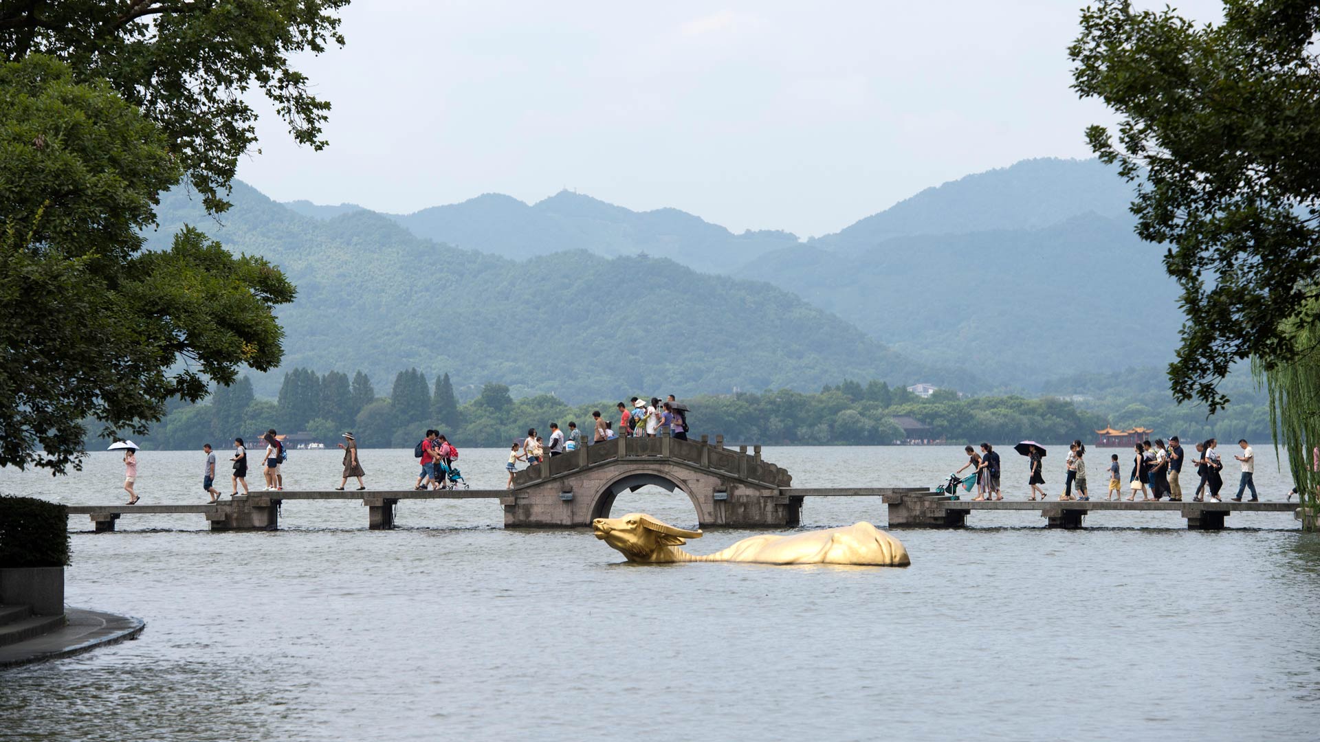 8月27日,游客在西湖邊涌金橋欣賞西湖風(fēng)景。 新華社記者 鞠煥宗 攝
