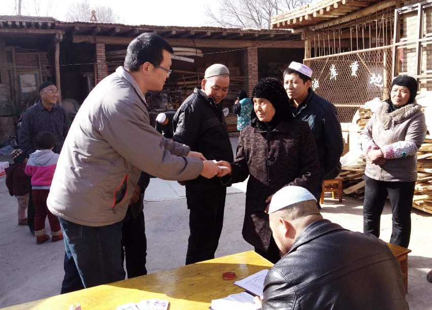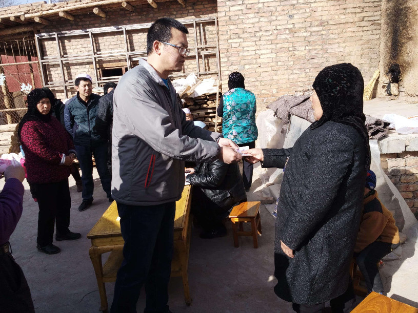 包毅為貧困戶發(fā)放慰問金,宣傳精準(zhǔn)扶貧政策