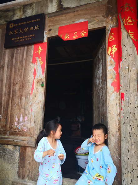 告別了土地廟,沿著紅軍街繼續(xù)東行,上一道坡來到紅軍大學遺址。這座普通的民房雖然掛著文物的標識,如今還有人家居住在此。一個4歲的小男孩和他6歲的姐姐坐在門檻上看著我們,小女孩有點害羞,小男孩說話干脆利落。我倆有了如下對話: