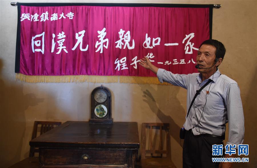 在寧夏西吉縣單家集村,西吉縣單南村黨支部書記單云在介紹“回漢兄弟親如一家”的錦匾(復(fù)制品)(8月11日攝)。新華社記者 羅曉光 攝
