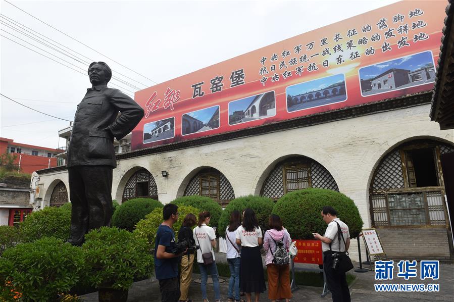 參加“記者再走長征路”活動的記者在陜西省子長縣瓦窯堡革命舊址采訪(8月9日攝)。新華社記者 羅曉光 攝