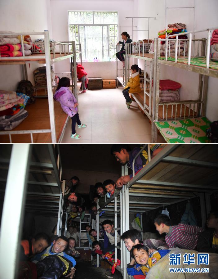 這是一張拼版照片。上圖:在大化瑤族自治縣板升鄉(xiāng)弄勇小學(xué),同學(xué)們?cè)谛滤奚崂铮?019年5月8日攝);下圖: 2012年12月26日,在弄勇小學(xué),同學(xué)們擠在10多平方米的“大通鋪”上準(zhǔn)備睡覺。新華社記者 黃孝邦 攝