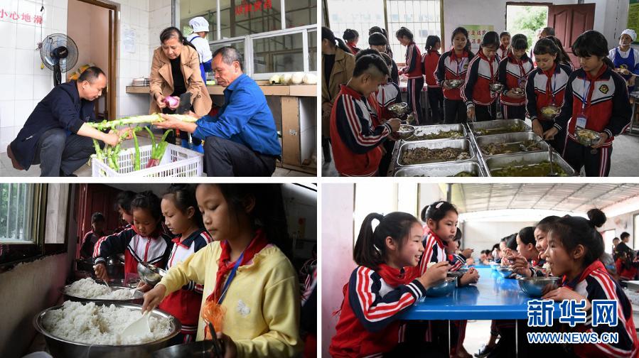 這是一張拼版照片。上左:在融水苗族自治縣東陽(yáng)村小學(xué),廚房師傅們?cè)跍?zhǔn)備營(yíng)養(yǎng)午餐;上右:東陽(yáng)村小學(xué)學(xué)生根據(jù)需要挑選菜肴。下左:東陽(yáng)村小學(xué)學(xué)生排隊(duì)打飯;下右:東陽(yáng)村小學(xué)學(xué)生在食用營(yíng)養(yǎng)午餐。近年來,廣西在貧困地區(qū)大力推行學(xué)生營(yíng)養(yǎng)餐,幫助貧困學(xué)生健康成長(zhǎng)(2019年5月6日攝)。新華社記者 張愛林 攝