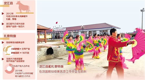 龍江縣是著名的雜糧產(chǎn)區(qū)、畜牧大縣。如今,龍江和牛已成為龍江縣畜牧產(chǎn)業(yè)的一張名片,帶領(lǐng)群眾走上致富路?!拔覀冄芯恐贫恕陡邫n肉牛優(yōu)勢(shì)特色產(chǎn)業(yè)集群建設(shè)方案》,從2016年起出臺(tái)了扶持政策?!饼埥h委副書(shū)記孫立軍告訴記者,當(dāng)?shù)匾龑?dǎo)企業(yè)與農(nóng)戶合作養(yǎng)牛,農(nóng)戶每購(gòu)買(mǎi)兩頭母牛,政府會(huì)給予一定的補(bǔ)貼款。此外,政府還向企業(yè)采購(gòu)凍精幫助農(nóng)戶繁育小牛,小牛犢生長(zhǎng)到6個(gè)月達(dá)標(biāo)后,由企業(yè)統(tǒng)一收購(gòu),價(jià)格在1.2萬(wàn)元至1.4萬(wàn)元不等。