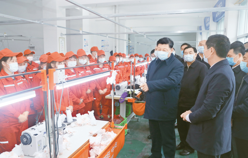 2020年4月20日至23日,中共中央總書記、國家主席、中央軍委主席習(xí)近平在陜西考察。這是4月21日,習(xí)近平在安康市平利縣老縣鎮(zhèn)錦屏社區(qū)考察社區(qū)毛絨玩具廠,了解搬遷群眾就業(yè)情況。 新華社記者 鞠鵬/攝