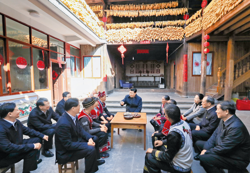 2021年2月3日至5日,中共中央總書記、國家主席、中央軍委主席習(xí)近平來到貴州考察調(diào)研,看望慰問各族干部群眾,向全國各族人民致以美好的新春祝福。這是3日下午,習(xí)近平在畢節(jié)市黔西縣新仁苗族鄉(xiāng)化屋村文化廣場上,向全國各族人民、港澳臺同胞和海外僑胞拜年。 新華社記者 謝環(huán)馳/攝