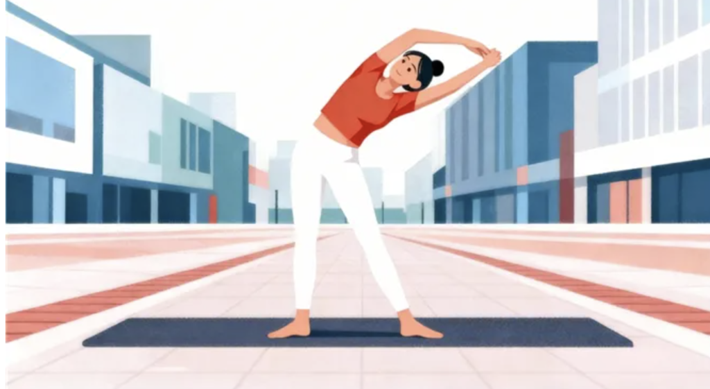 2.侧向伸展:站立位,双脚与肩同宽,双手交叉举过头顶;向左侧缓慢弯腰,直到右侧腰部有拉伸感(不要扭转身体),保持15-20秒,回到中立位后换侧重复,每侧2-3组。