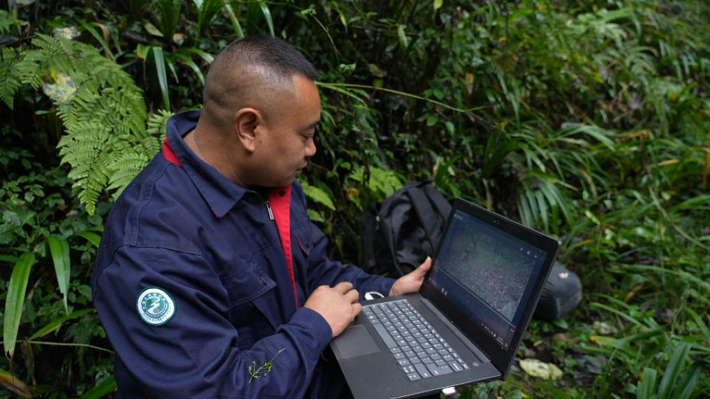 蒋邦琼在查看红外相机情况。新华社发(焦国斌摄)