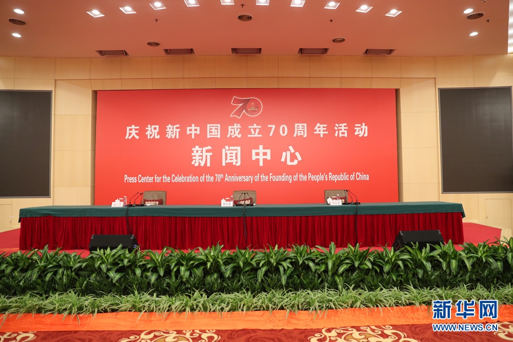 9月27日,慶祝中華人民共和國成立70周年活動新聞中心在梅地亞中心二層新聞發(fā)布廳舉辦第三場新聞發(fā)布會,中央農(nóng)村工作領(lǐng)導(dǎo)小組辦公室主任、農(nóng)業(yè)農(nóng)村部部長韓長賦,國務(wù)院扶貧開發(fā)領(lǐng)導(dǎo)小組辦公室主任劉永富介紹全面建成小康社會,扎實推進(jìn)脫貧攻堅和鄉(xiāng)村振興,并回答記者提問。圖為發(fā)布廳現(xiàn)場。新華網(wǎng) 陳杰 攝