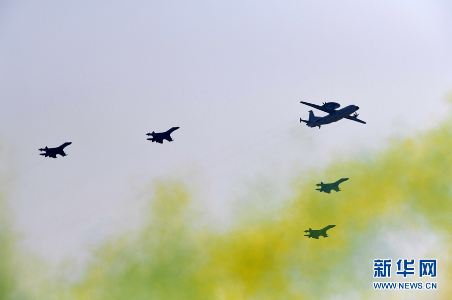 預警指揮機梯隊由空警-500、空警-200預警機和運-8指通機作為領隊機,分別由4架殲-11B戰(zhàn)機護衛(wèi)。