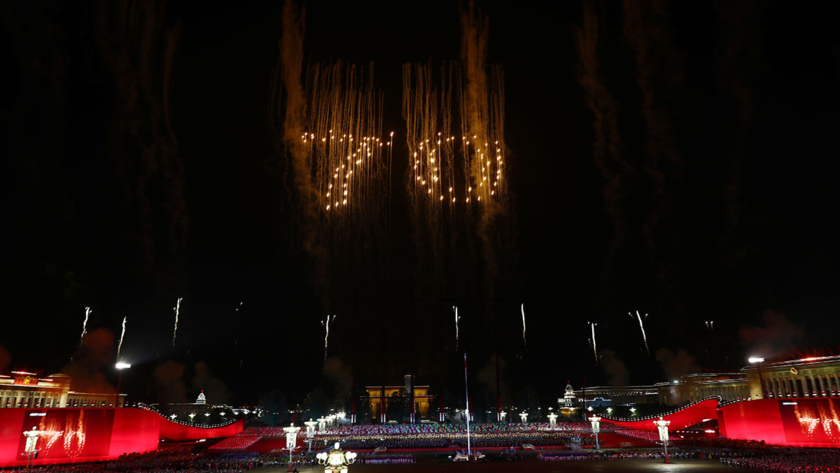 聯(lián)歡活動(dòng)分“紅旗頌”“我們走在大路上”“在希望的田野上”“領(lǐng)航新時(shí)代”4個(gè)篇章,由主題表演、中心聯(lián)歡表演、群眾聯(lián)歡和煙花表演組成