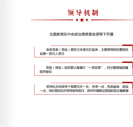 • 主題教育是以習(xí)近平同志為核心的黨中央作出的重大部署,領(lǐng)導(dǎo)干部要提升政治站位,擔(dān)負(fù)好領(lǐng)導(dǎo)指導(dǎo)責(zé)任,抓好所屬單位黨組織的主題教育。對消極對待、敷衍應(yīng)付的,要嚴(yán)肅批評;對走形變樣、問題嚴(yán)重的,要給予組織處理,切實解決執(zhí)行能力不強(qiáng)、執(zhí)行底氣不夠等問題,確保主題教育取得實實在在成效。 [詳細(xì)]