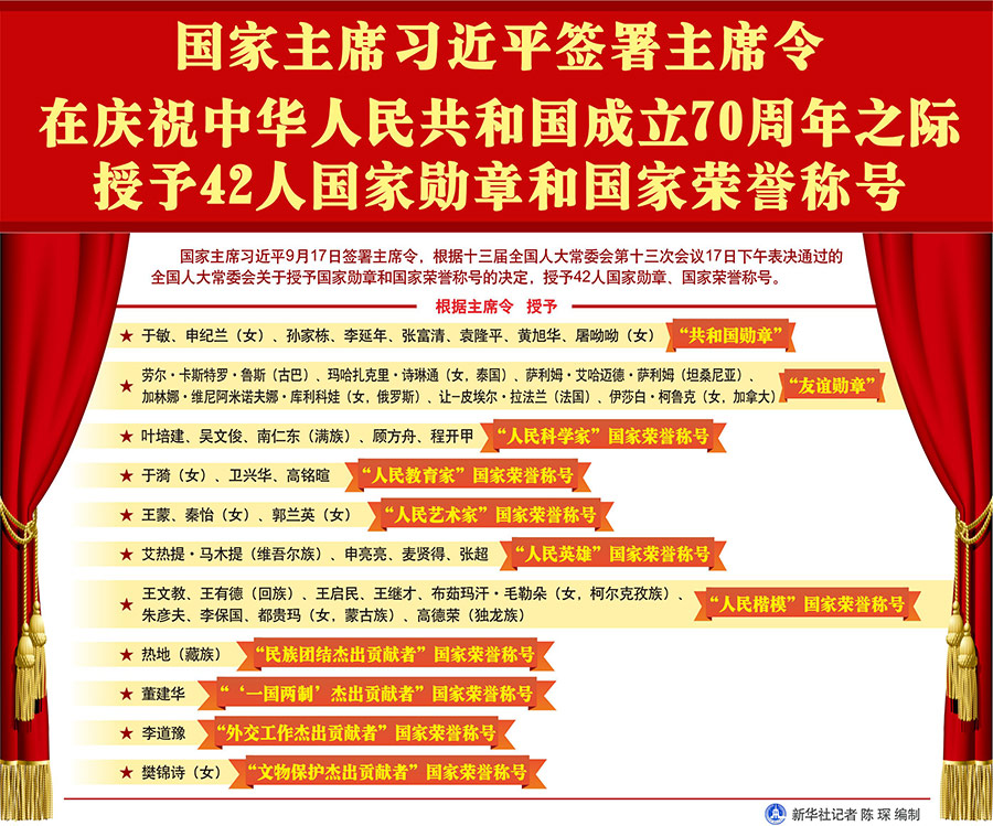 新華社北京9月17日電? 國(guó)家主席習(xí)近平17日簽署主席令,根據(jù)十三屆全國(guó)人大常委會(huì)第十三次會(huì)議17日下午表決通過的全國(guó)人大常委會(huì)關(guān)于授予國(guó)家勛章和國(guó)家榮譽(yù)稱號(hào)的決定,授予42人國(guó)家勛章、國(guó)家榮譽(yù)稱號(hào)。