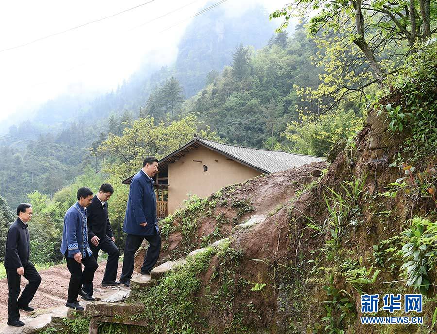 2019年4月15日,在重慶石柱土家族自治縣中益鄉(xiāng)華溪村,習(xí)近平踏著濕滑的石階登上陡坡,前往貧困戶(hù)譚登周家看望。新華社記者 謝環(huán)馳 攝